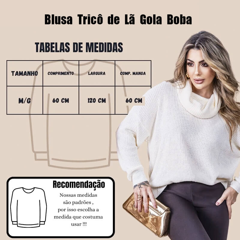 O grande destaque está na gola boba, que cria um caimento naturalmente drapeado no colo, formando dobras delicadas que valorizam o visual. Esse detalhe confere à peça um ar sofisticado e moderno, tornando-a ideal para compor looks elegantes e aconchegantes na estação.